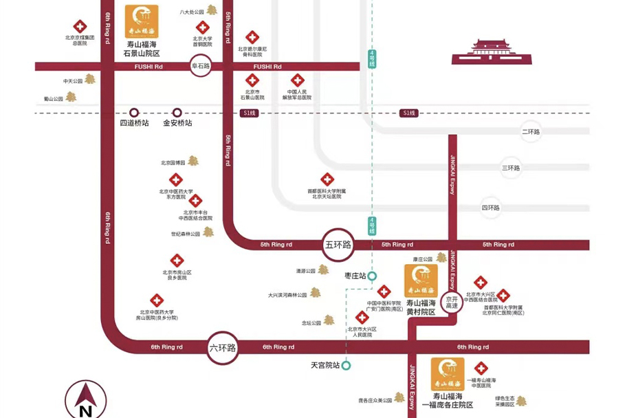 石景山院建筑采用中国传统皇家园林风格,雕梁 画栋耸立,亭台水榭交错。中心占地面积近25, 000平方米,机构建筑面积近30,000平方米,床 位设置600余张。